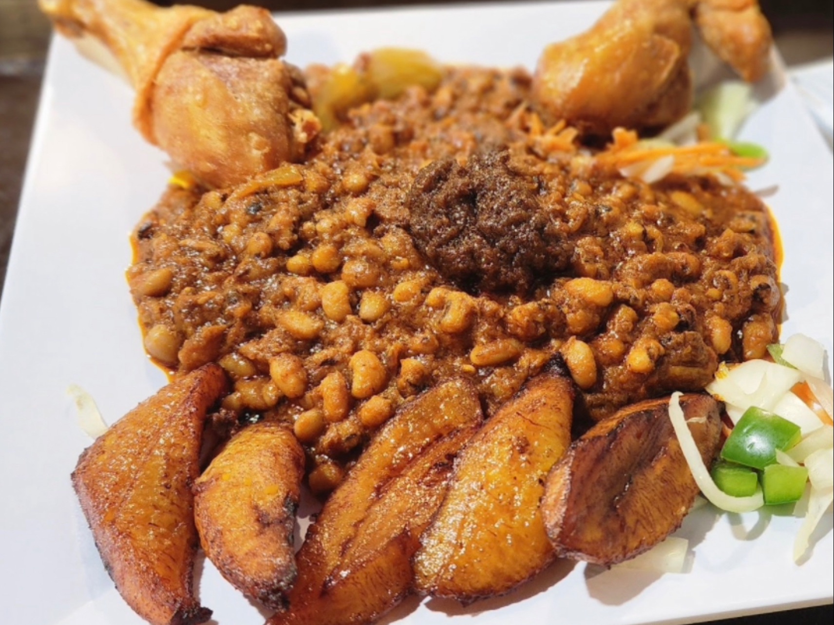 Red Red (Ghanaian Beans Stew): This is the most iconic version. It is a hearty stew made with black-eyed peas, palm oil, tomatoes, and onions and served with fried rip plantains, or rice. Please chose protein - Chicken of Fish