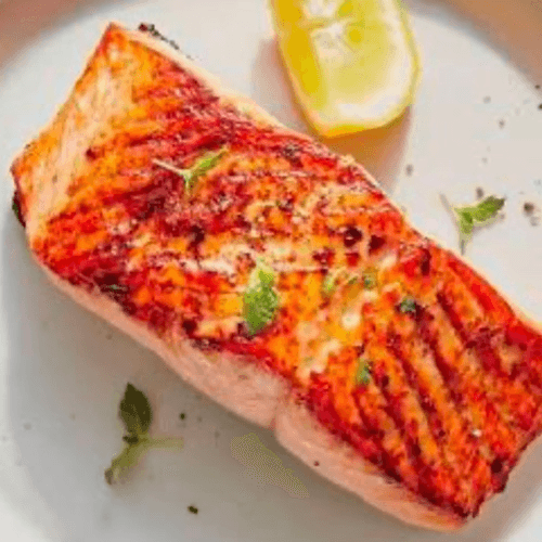 A large fresh cut salmon filet broiled to perfection and served with lemon wedge, baked potato and broccoli