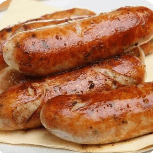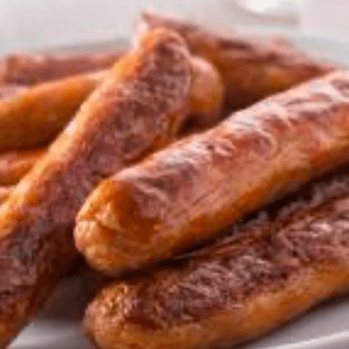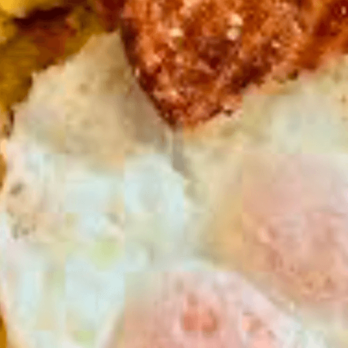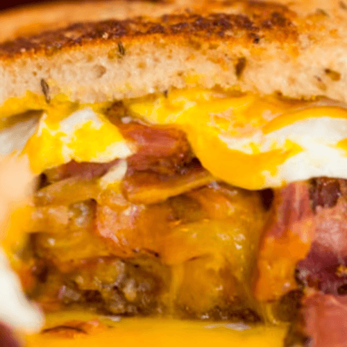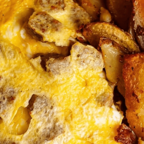 Two fried eggs, breakfast sausage, cheddar cheese, home fries and more cheddar cheese on a brioche bun.