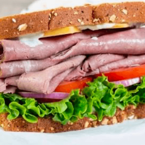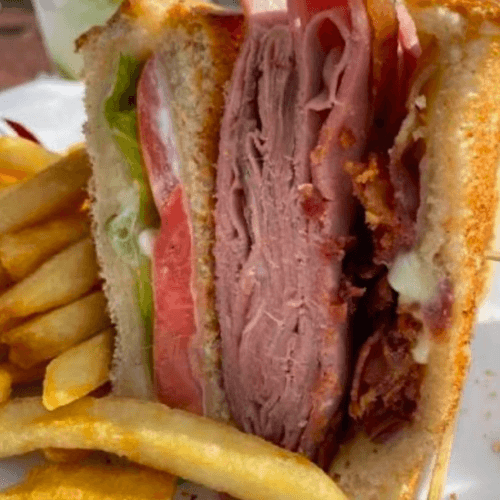 Thin sliced in house seasoned roast beef, crisp BACON,LETTUCE, TOMATO, and mayonnaise on on three slices of toast of your choice with a pickle on the side and French fries and coleslaw