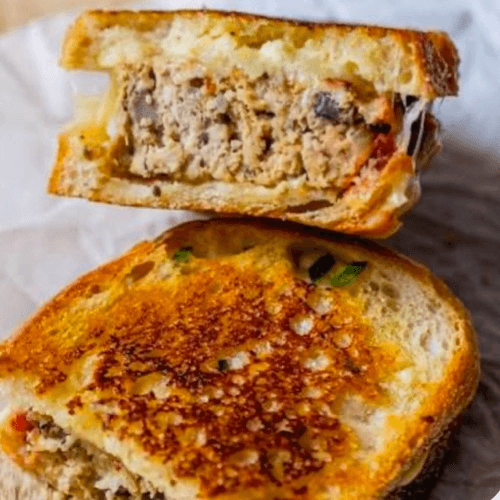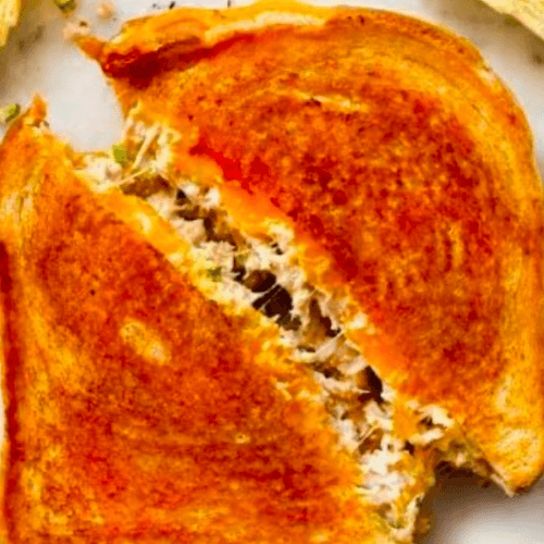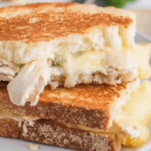 In house made chicken salad grilled on white bread with melted cheese and a pickle on the side