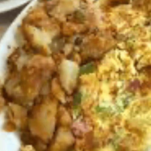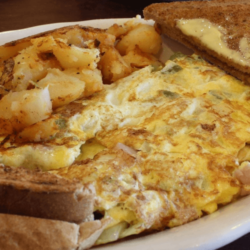 With tomato, onion, pepper and mushroom served with home fries and toast
