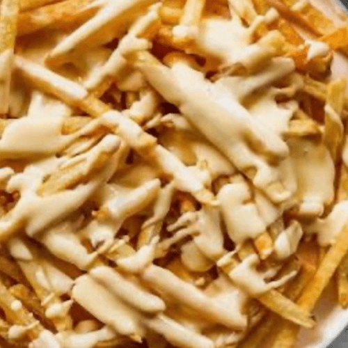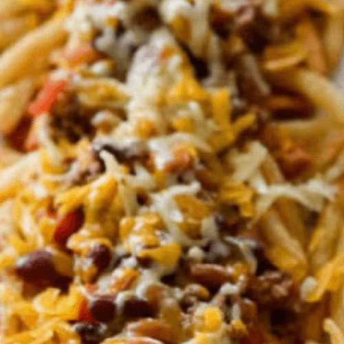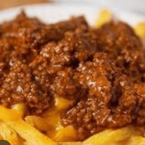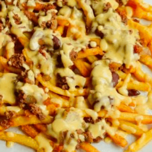 French fries topped with chili, bacon, jalapeno peppers, monterey Jack cheese and cheddar cheese
