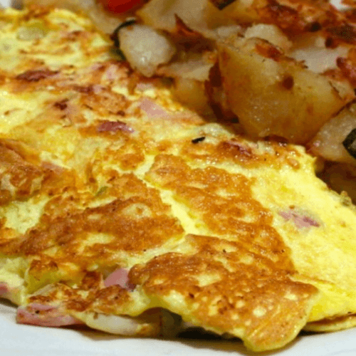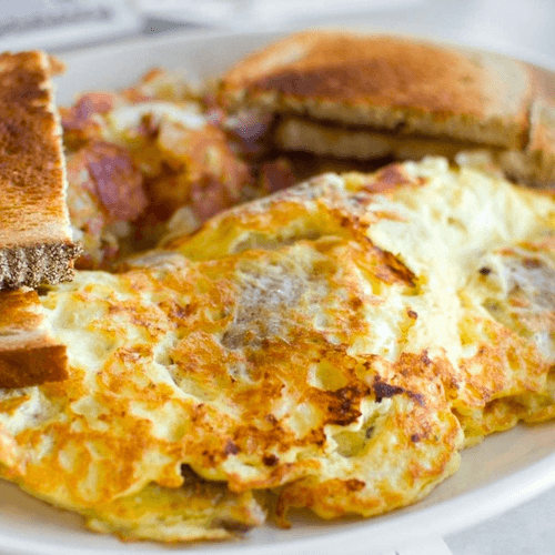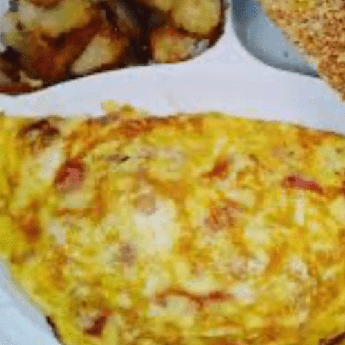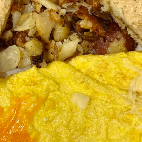 Bacon, ham, sausage, mushroom, onion, peppers, american cheese and swiss cheese served with home fries and toast