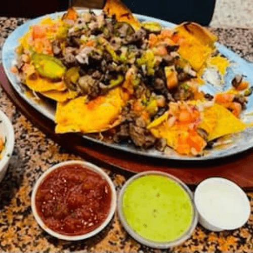 Thin sliced shredded steak SOUR CREAM,SALSA and guacamole