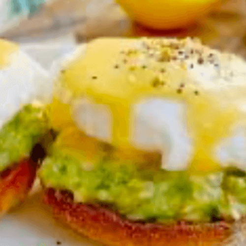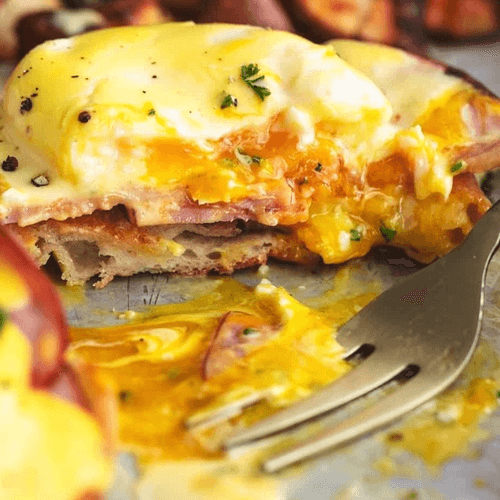 Poached eggs with Canadian bacon on a toasted English muffin with hollandaise sauce