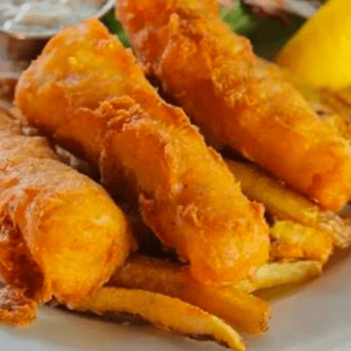 A generous portion of cod fish battered and fried golden crispy. Served with lemon wedge, fresh made tartar sauce, French fries and coleslaw
