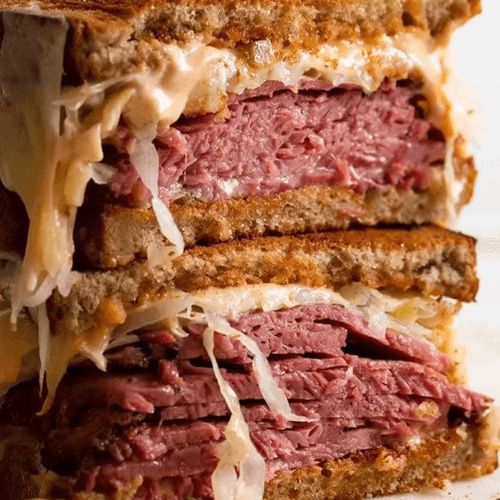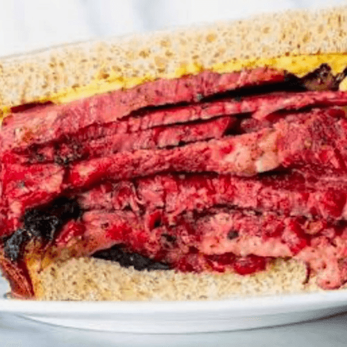 Two eggs with grilled pastrami, Swiss cheese and grilled tomato all melted together on grilled rye.