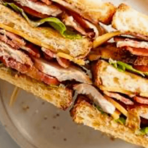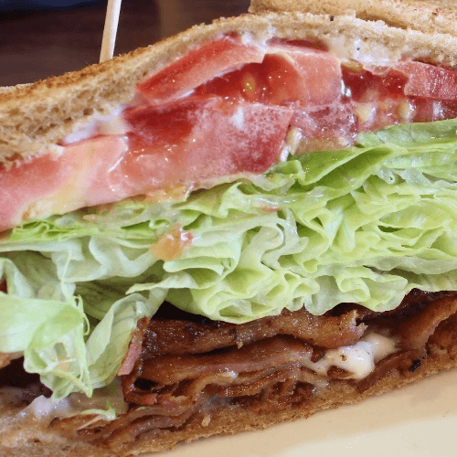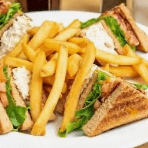 In house marinated grilled chicken breast on three slices of toast of your choice with crisp BACON,LETTUCE, TOMATO, mayonnaise with French fries and a pickle on the side