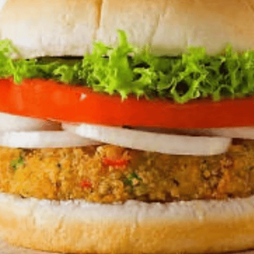 A healthier and leaner version of the burger on a brioche bun with lettuce, tomato and a pickle on the side
