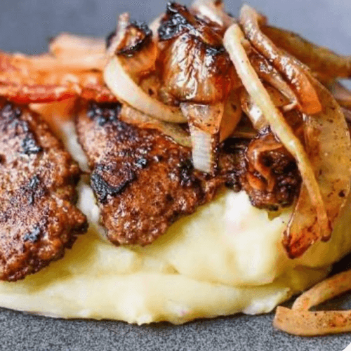 Fresh cut liver grilled with crisp bacon and onions, mashed potato and corn