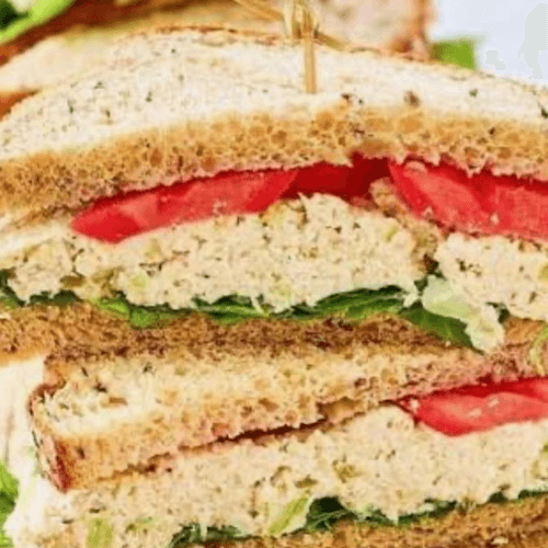 In house made fresh chicken salad on three slices of your choice of bread with lettuce tomato mayonnaise crisp bacon and cole slaw and a pickle on the side with French fries