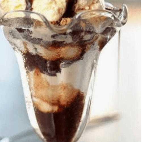 Two scoops of your choice of ice cream with whipped cream and flavored syrup