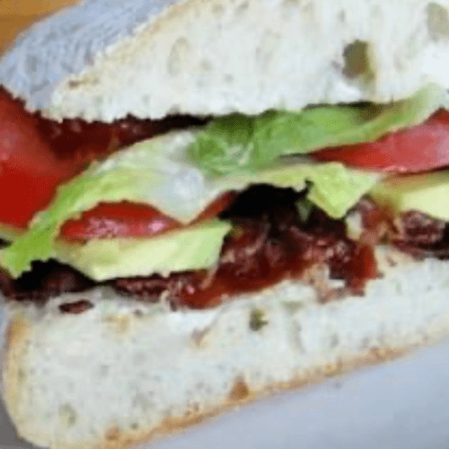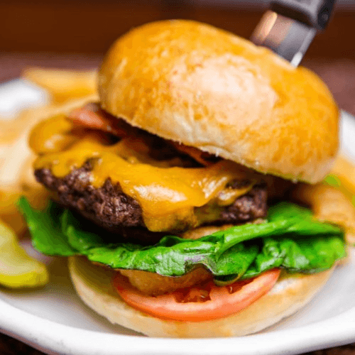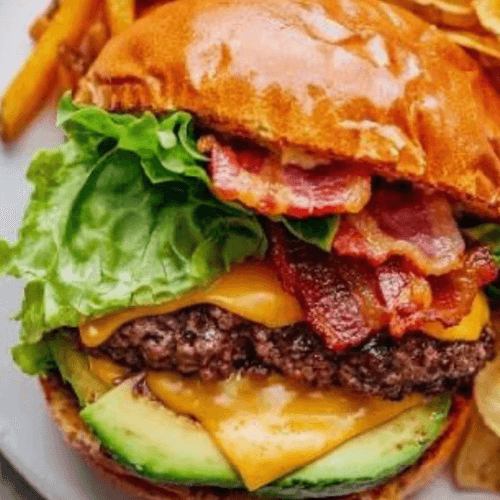 8 ounce burger on a brioche bun with bacon, cheddar cheese, avocado, lettuce, tomato and a pickle on the side