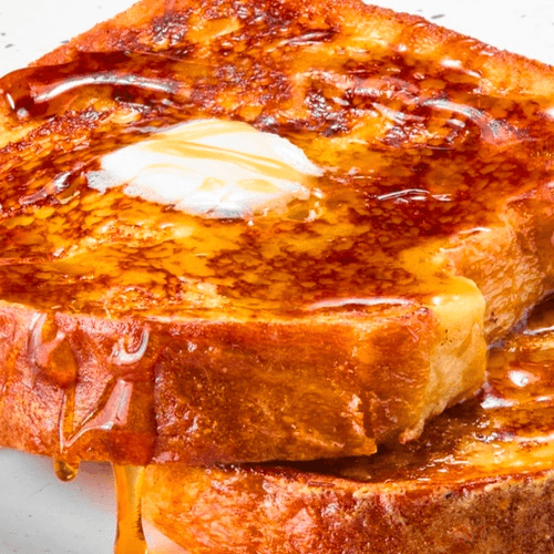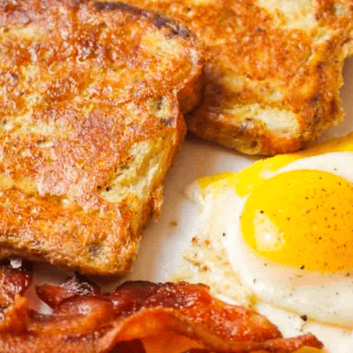 2 pieces of french toast, 2 eggs, 2 pieces of bacon, 2 pieces of pork sausage links and homefries