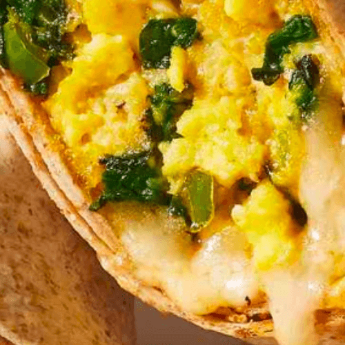 Two egg whites with spinach, mushrooms, tomatoes, broccoli, avocado, and onions on a whole wheat wrap