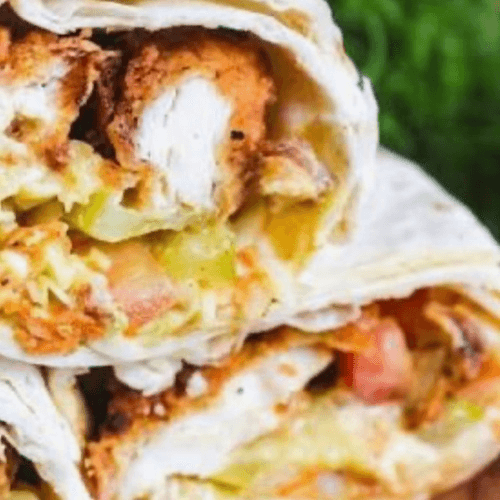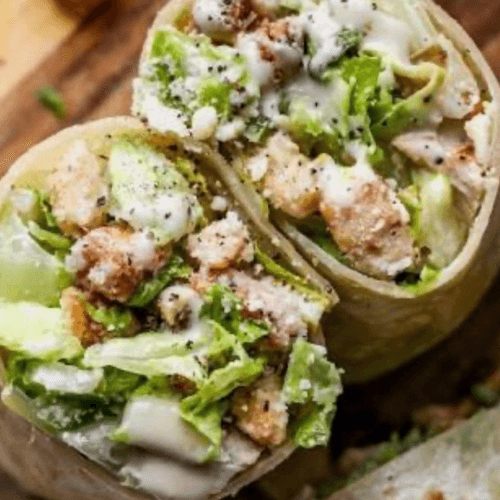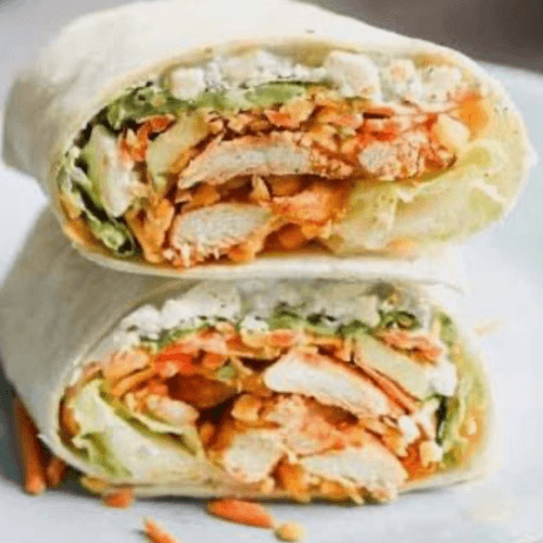 SPICY FRIED CHICKEN CUTLET TENDERS WITH CRISP ROMAINE LETTUCE,CHEDDAR CHEESE AND BLEU CHEESE DRESSING INSIDE