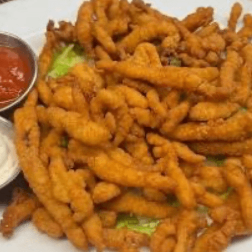 Golden fried clam strips served with lemon wedge, homemade tartar sauce, French fries and Cole slaw