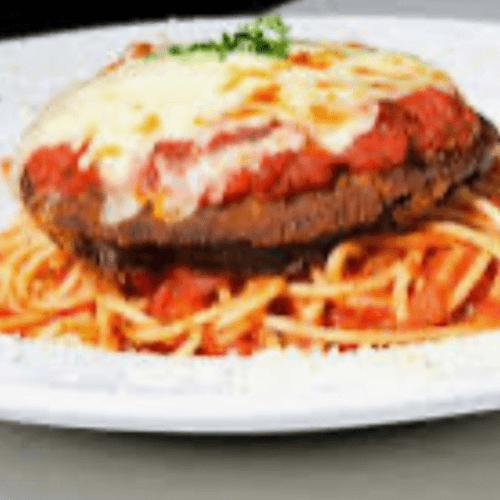 Breaded eggplant topped with marinara sauce and mozzarella cheese blend and baked in the oven with your choice of spaghetti. Linguine, fettuccine or ziti.