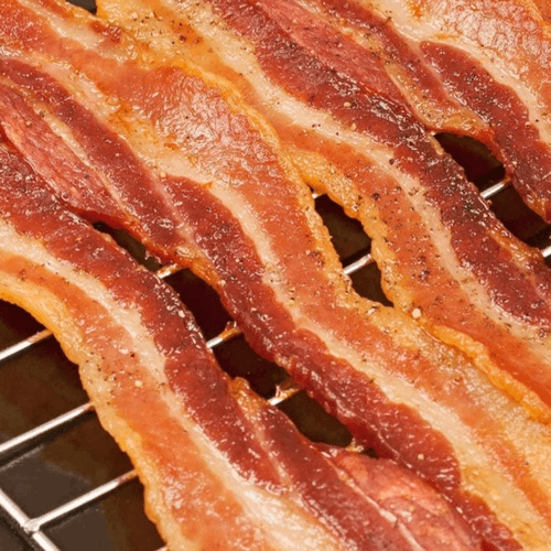 8 ounce burger with crisp bacon, onion, lettuce and tomato on a ciabbata roll with a pickle on the side