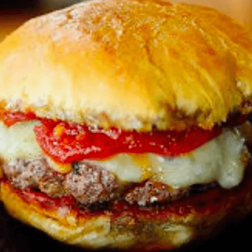 1/2 pound burger served on a brioche bun with marinara sauce, mozzarella cheese and a pickle on the side
