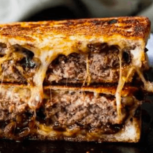 GRILLED RYE BREAD,SWISS CHEESE,FRIED ONION and a picke on the side