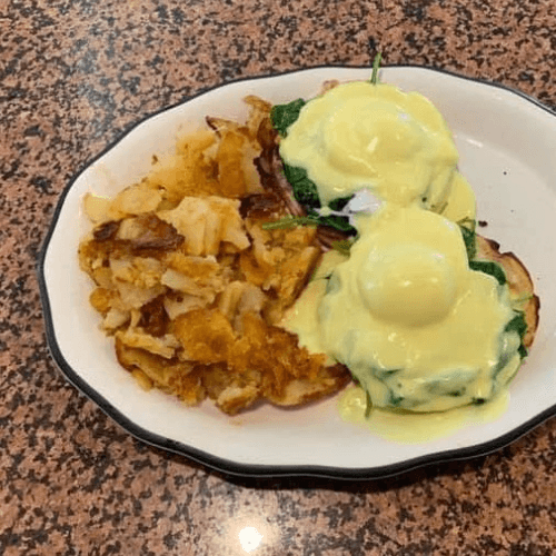 Poached eggs with spinach on a toasted English muffin with hollandaise sauce