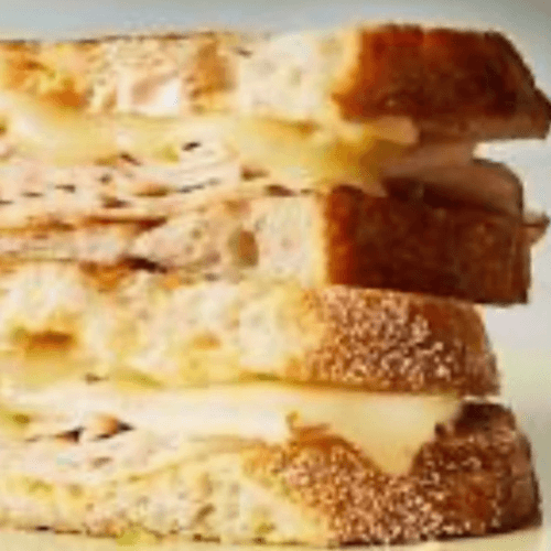 Fresh in house roasted turkey breast on grilled bread with melted cheese and a pickle on the side