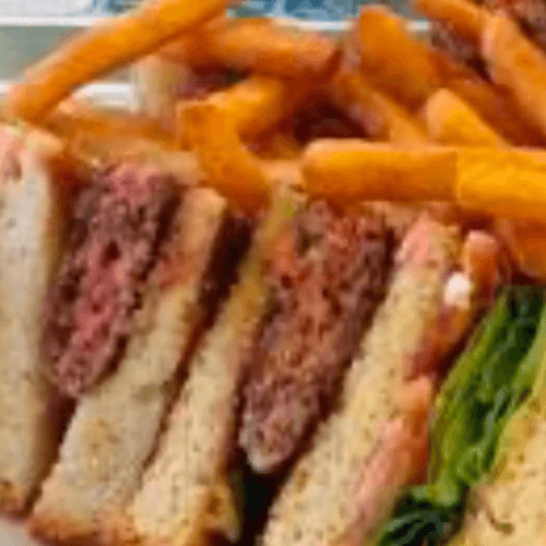 Fresh ground chuck burger grilled to perfection on your choice of three slices of toast with crisp BACON,LETTUCE, TOMATO, mayonnaise and a pickle on the side. With French fries and Cole slaw
