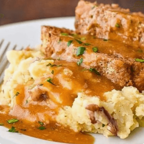 Our signature meatloaf topped with gravy and served with mashed potato and corn