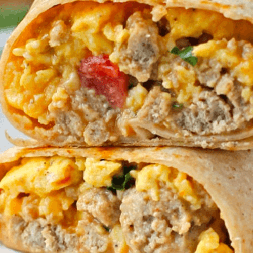 Two eggs with bacon, sausage, ham, and monterey jack cheddar cheese on a white wrap
