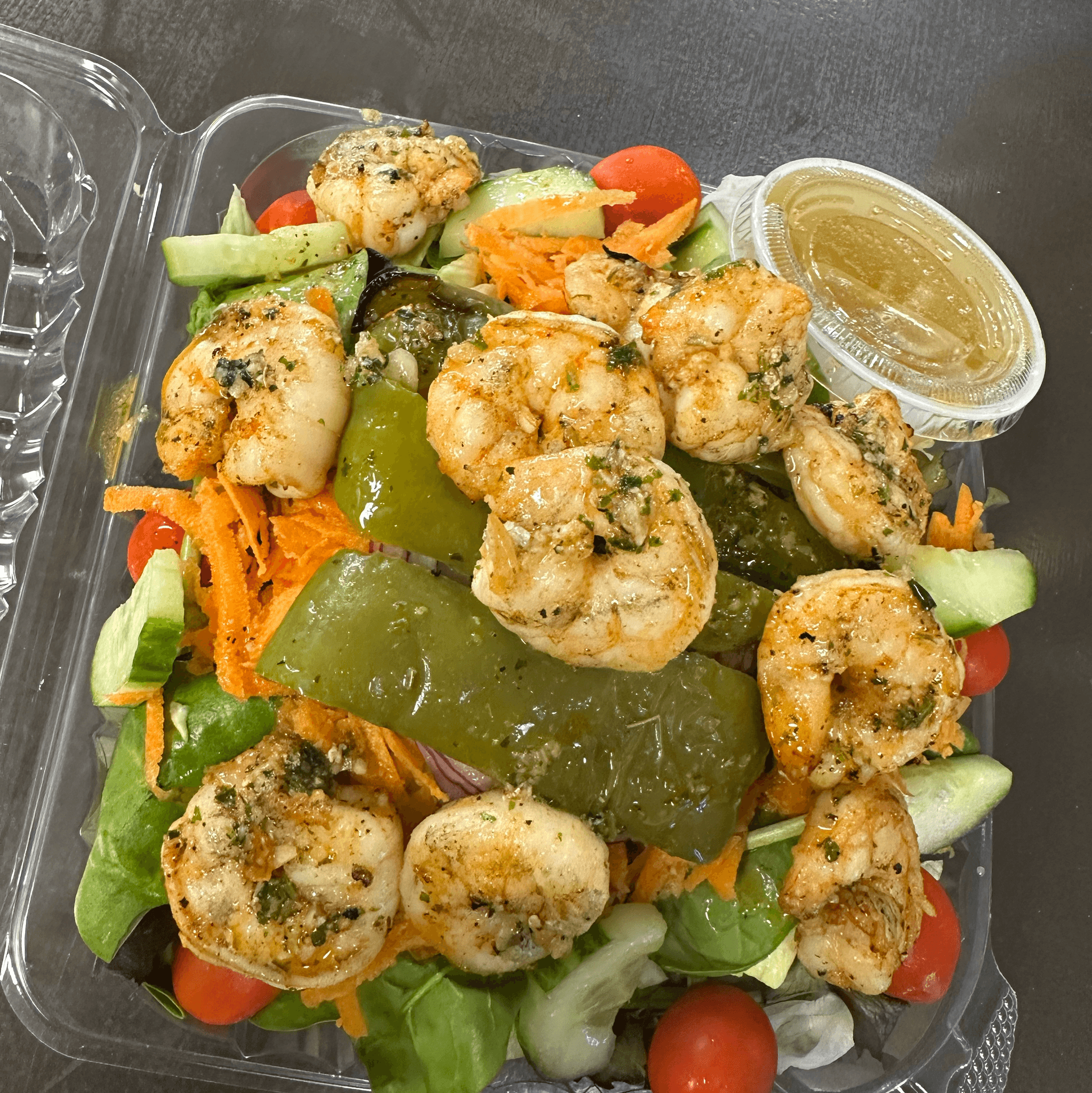 Garden salad with 3 cheeses, roasted peppers, and salami.